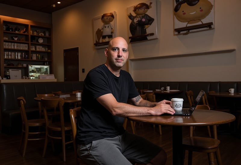 “Create an image of [Your Name] sitting in a cozy coffee shop, casually dressed, typing on a laptop with a cup of coffee nearby.”