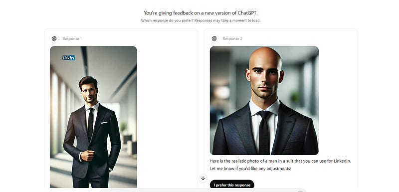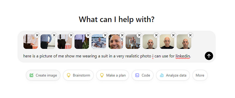 I tried to upload training images of myself but ChatGPT created cartoon images of me wearing a suit — and even one of their ideas of me even included hair…lol