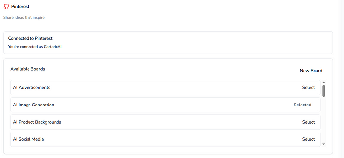 In the above Pinterest example screenshot, you will need to select a Pinterest Board or create one to post on. It will have one already selected but you may want to use or create a different one.